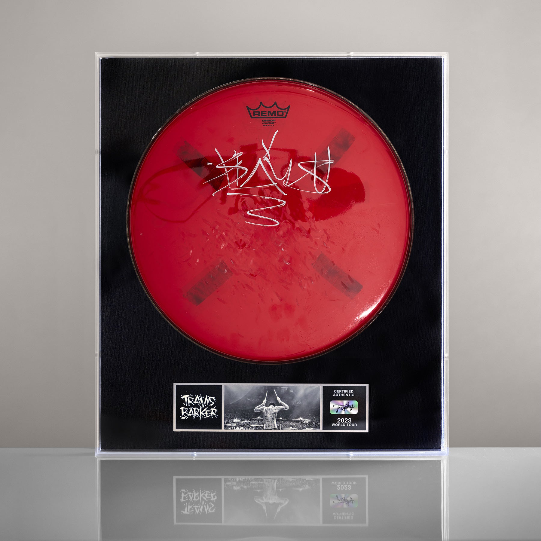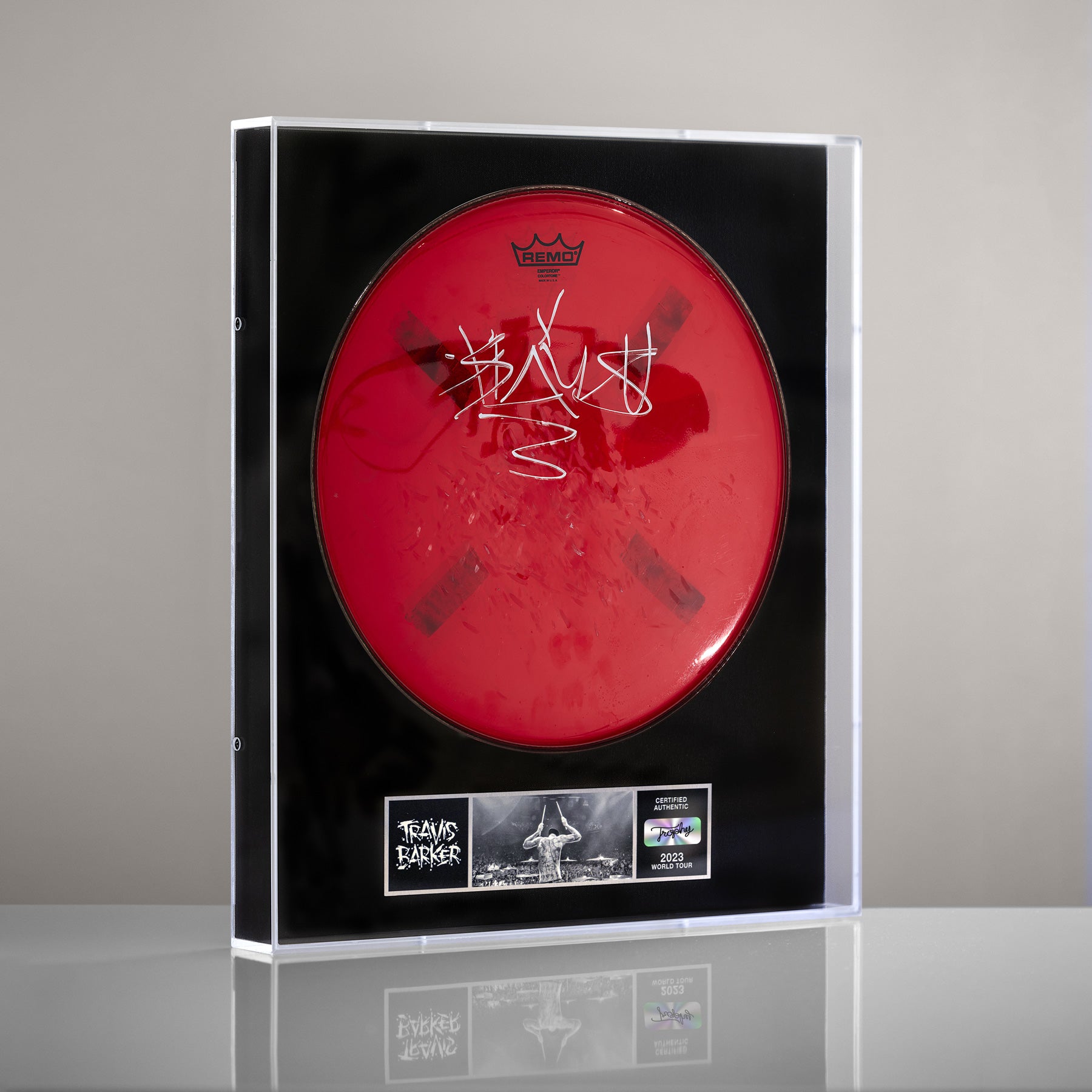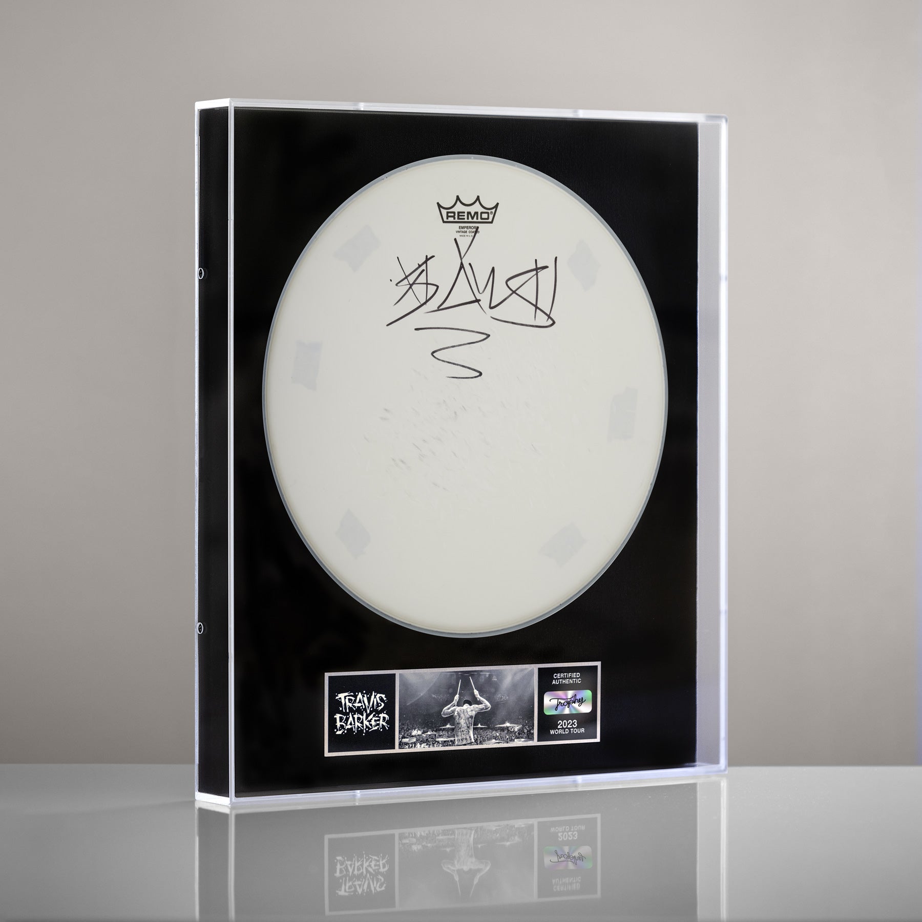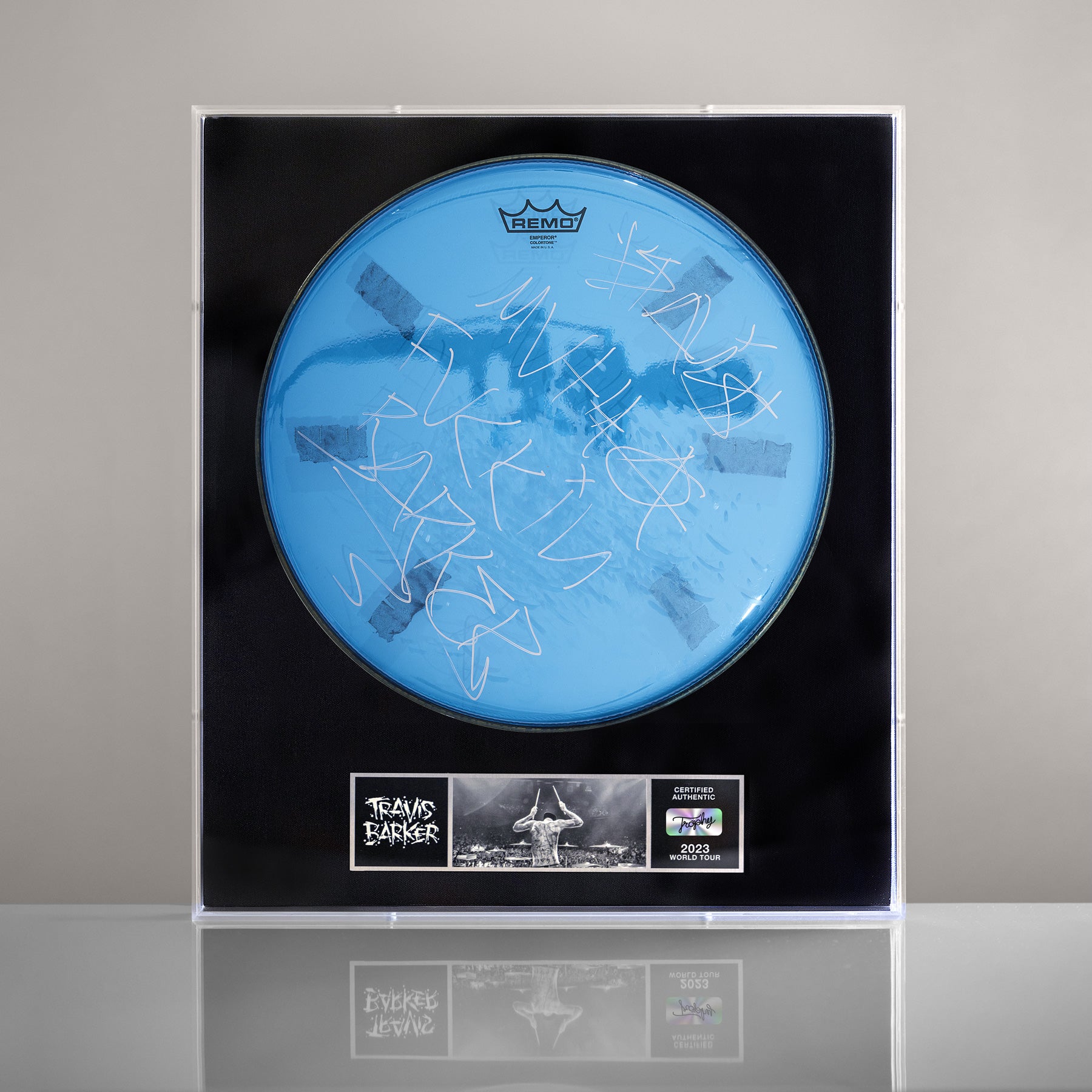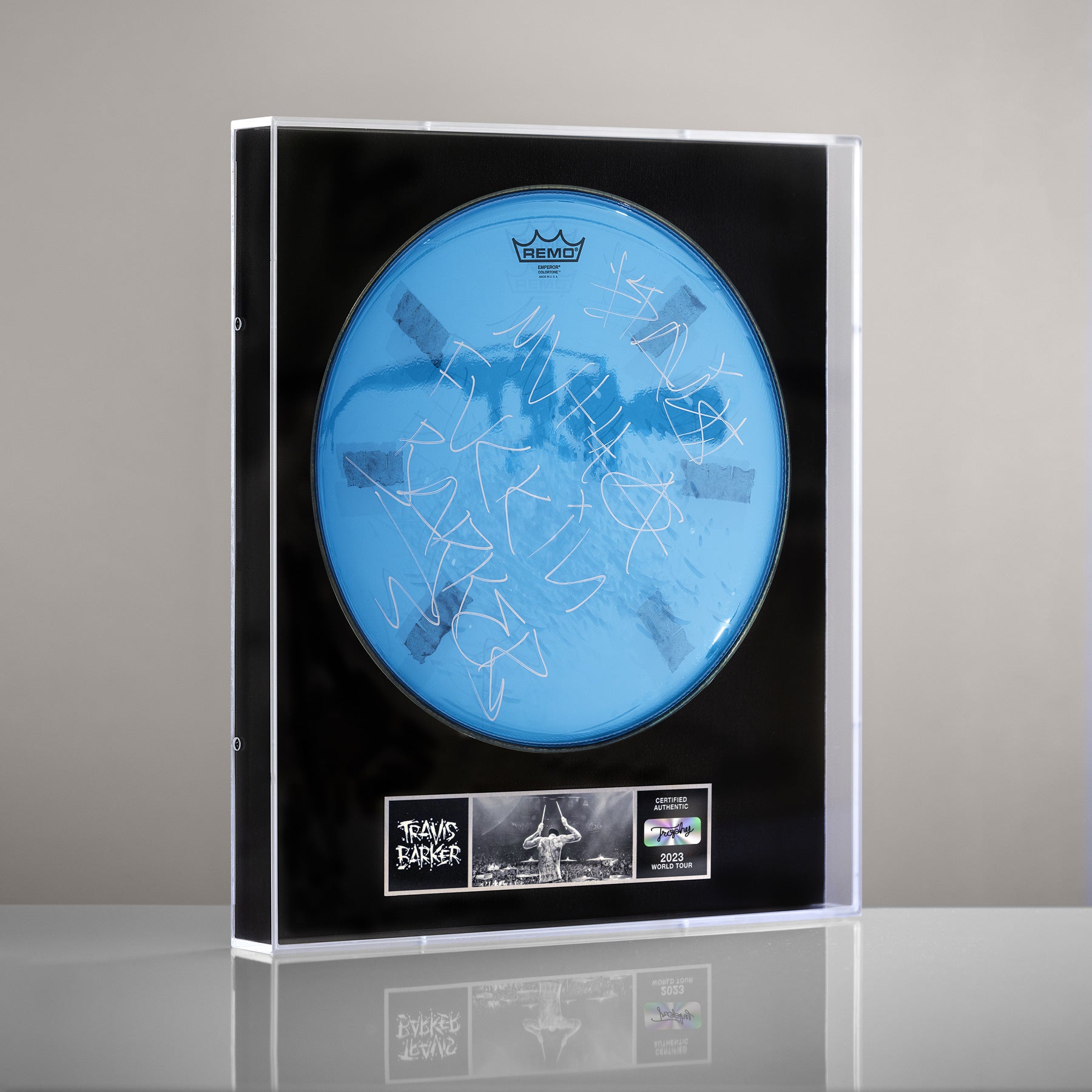 For the first time ever, fans and collectors have the rare opportunity to purchase a fully authenticated 16.5 inch Drum Head used by Travis Barker himself on his 2023 World Tour and the recording of the Blink182 album One More Time. Each piece is signed and features a custom serialized plaque that comes ready to display in a museum-grade wall mounted Trophy Case with hanging hardware.
