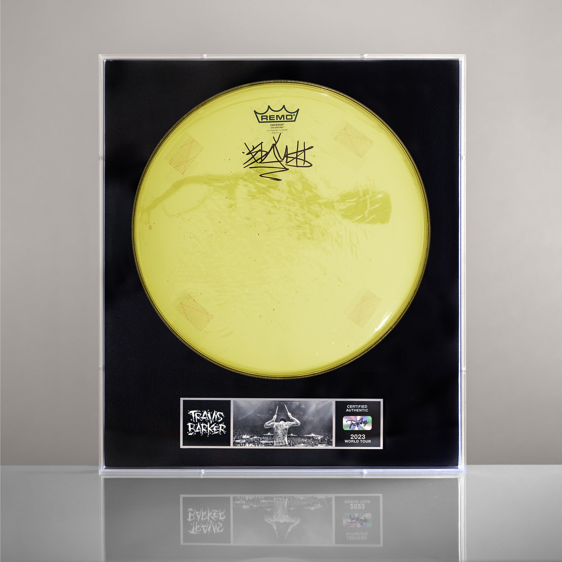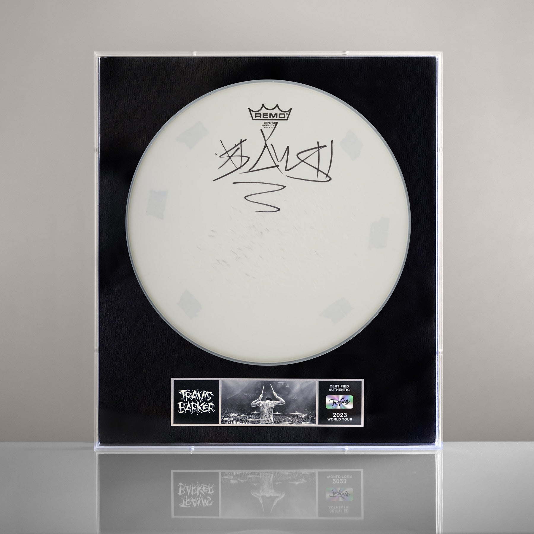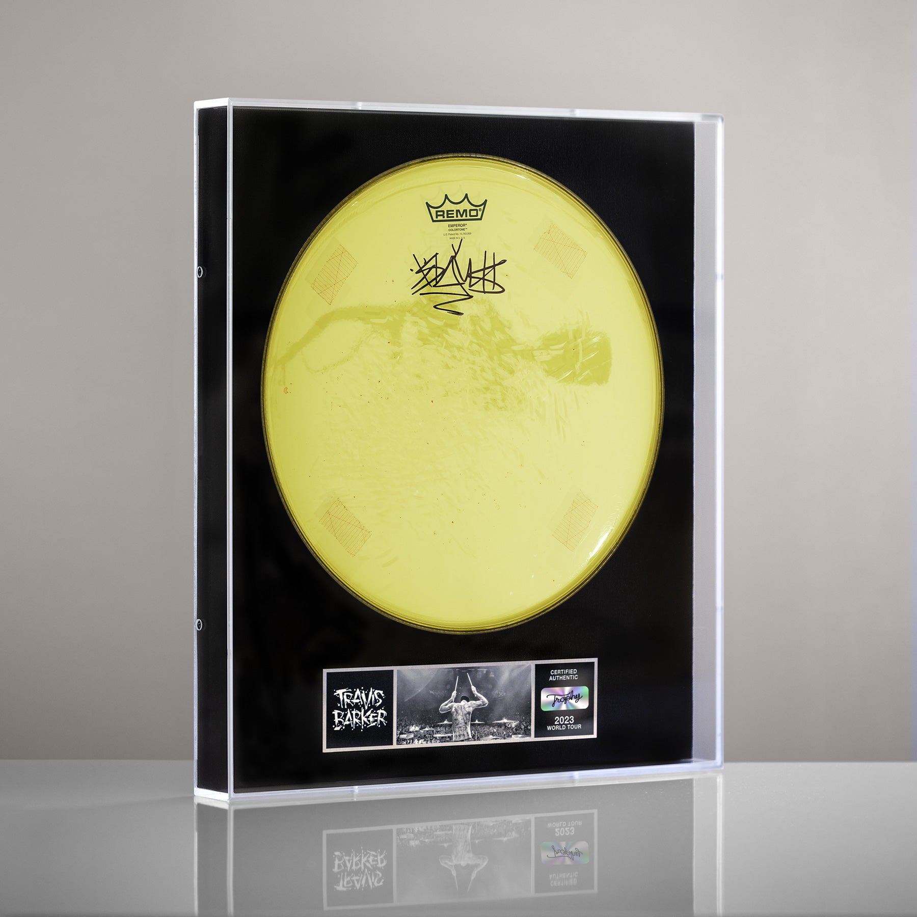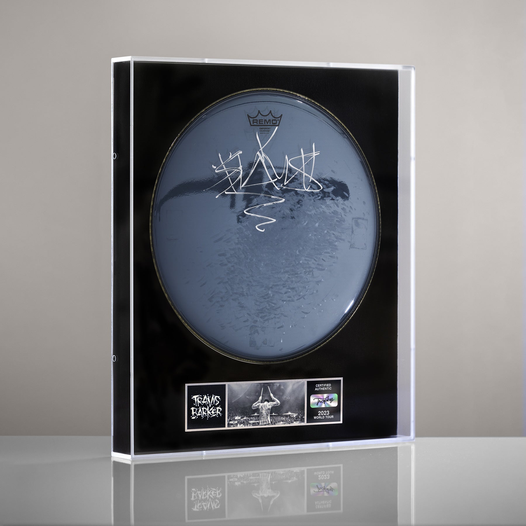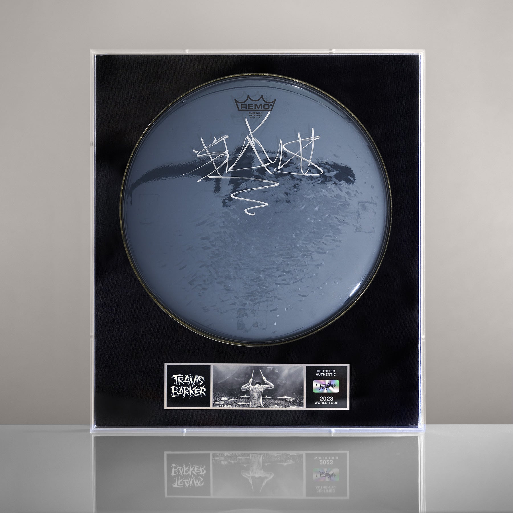 For the first time ever, fans and collectors have the rare opportunity to purchase a fully authenticated 16.5 inch Drum Head used by Travis Barker himself on his 2023 World Tour and the recording of the Blink182 album One More Time. Each piece is signed and features a custom serialized plaque that comes ready to display in a museum-grade wall mounted Trophy Case with hanging hardware.