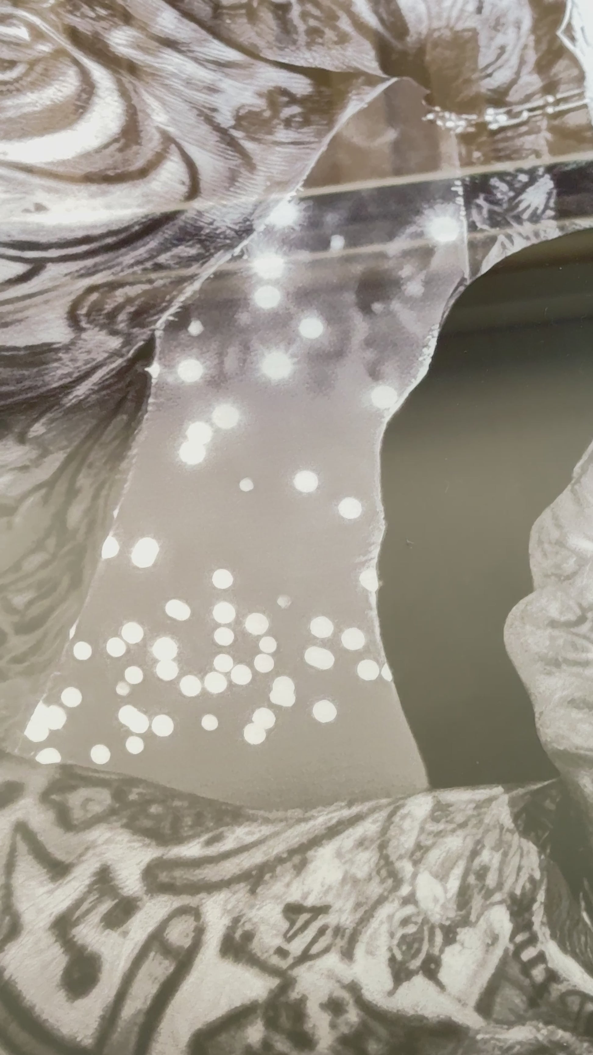 The artwork is first printed as a Giclée print onto transfer paper which is then applied to a coated 1.2mm aluminum panel. Heat and pressure transform dye into gas, bonding with aluminum polymers, before reverting to a solid state and fusing the image with the metal.
